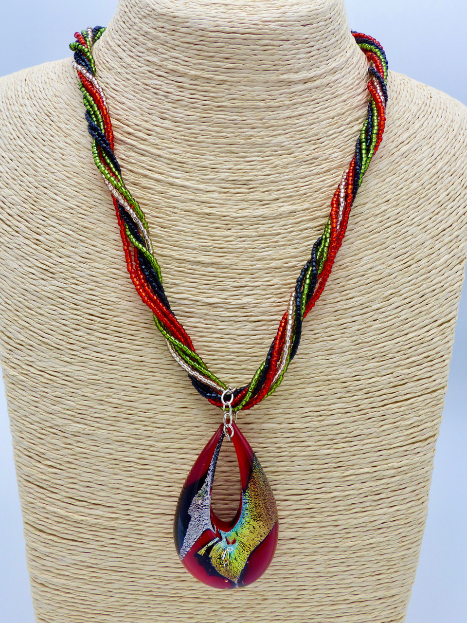 Loading... Please wait...This stunning design is so colorful and sophisticated. It features a limited edition Venetian dichotic pendant in tones of bright red, green, gold and black, strung on matching beads for a torsade effect with a vintage peridot clasp. Hate to part with it.