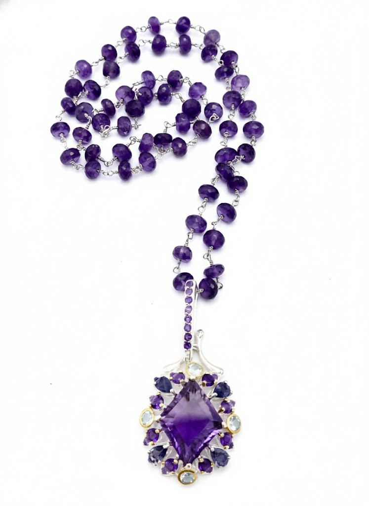 This lovely translucent faceted amethyst diamond shaped pendant is framed with blue and white topaz, hangs from a topaz bezel and a hand wire-wrapped amethyst chain. A definite showstopper.