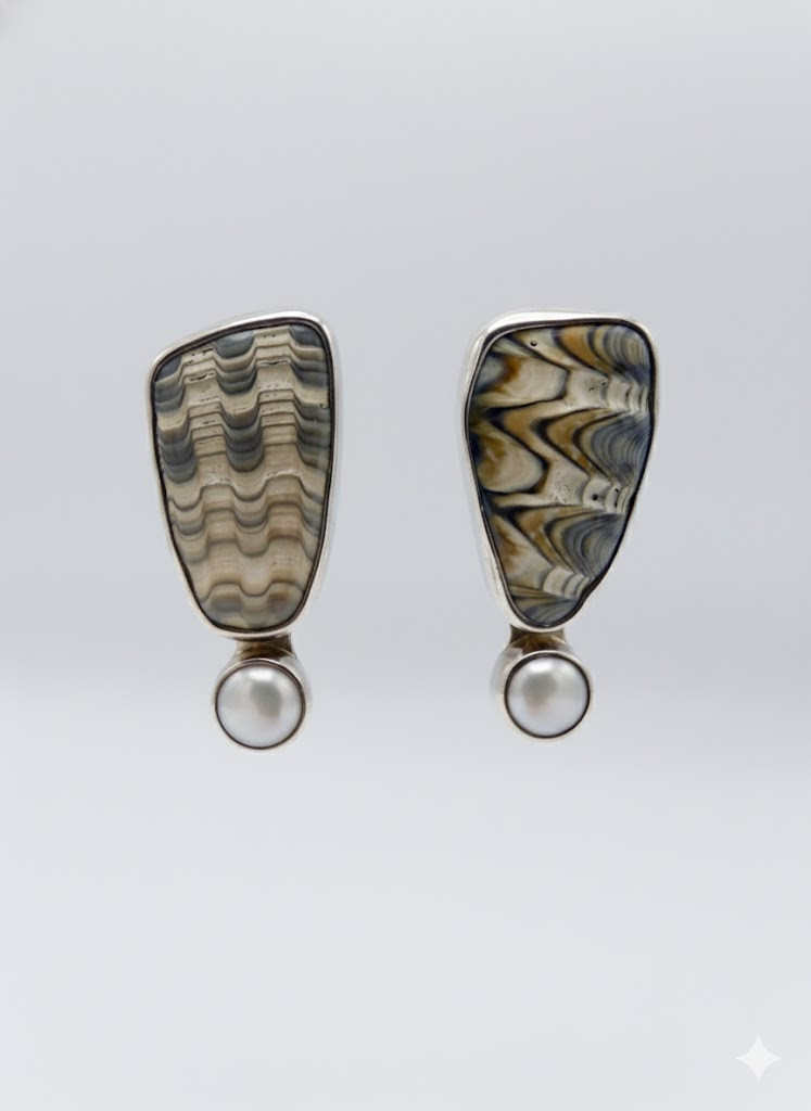 These beautifully made clip earrings by Margaret Thurman of Echo of the Dreamer feature interesting wave patterned jasper set in sterling silver with a freshwater pearl at the base.