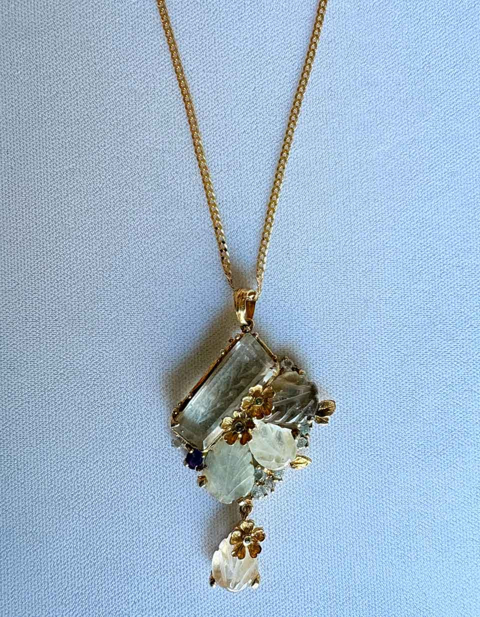 Elaborate Hand Carved Green Amethyst gemstone framed with multi Jewels and flowers and 24K vermeil Pendant on 24K Sterling Chain
